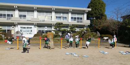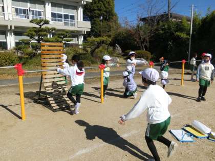 2年生の体育で、鉄棒を行っています。15のわざができるように、アドバイスをしながらがんばっています。
