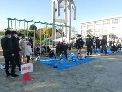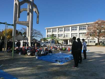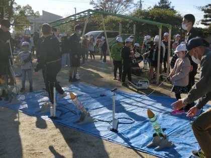 出来上がったペットボトルロケットを運動場で飛ばしました。遠くまで飛んでいくようすに、歓声が上がりました。豊田工科高校の生徒のみなさん、ありがとうございました。