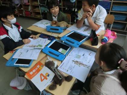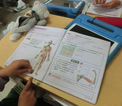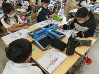 4年生の理科の授業です。グループで、からだを動かすための関節がどこにあるかを話し合っていました。話し合いながら、学習ノートには関節シールをはっていました。