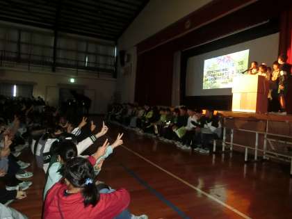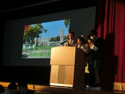 6年生による発表です。総合的な学習の時間に調べたことや国語の学習で考えたことをまとめて、プレゼンテーションを行いました。
