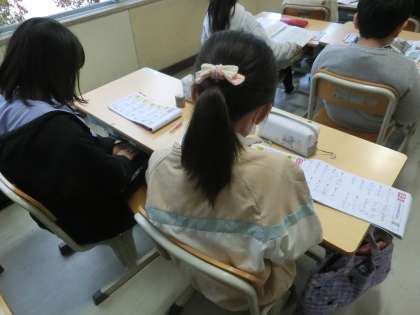 朝の学習の様子です。休み明けの月曜日ですが、落ち着いて学習に取り組んでいる児童が多いです。漢字や計算などの復習に取り組んでいます。写真下は、漢字の書き順を確認しているようすです。