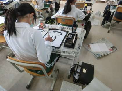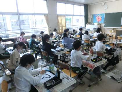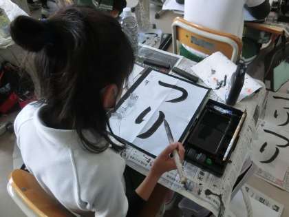 3年生の書写で、「つり」の文字を練習しています。「つ」、「り」の文字の曲がりやはらいの筆使いを考えて、ていねいに練習をしていました。