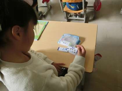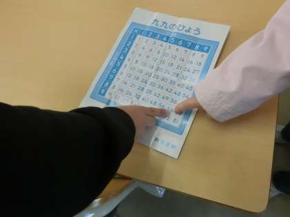 2年生が、九九を学習しています。今日の授業では九の段まで学びました。計算カードをつかったり、九九の表を使っています。写真下は、8×8の答えを指さしています。