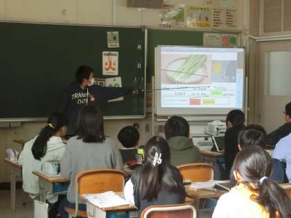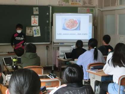 6年生の英語の授業です。料理の紹介を英語で行いました。使っている食材も英語で紹介していました。このような学習をとおして、英語での表現に慣れていきます。