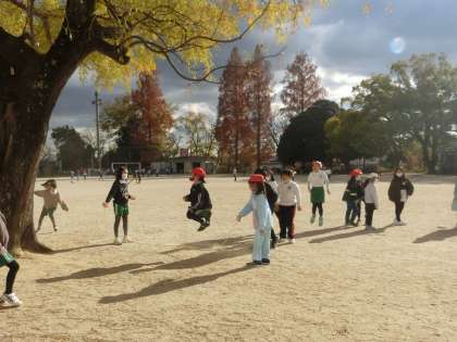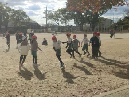 掃除の後の昼放課の運動場では、大なわとびをしている児童たちがいました。3年生の児童たちが最高96回とべたと教えてくれました。わなを回すスピードや飛ぶ高さなど、みんなでアドバイスし合っていました。