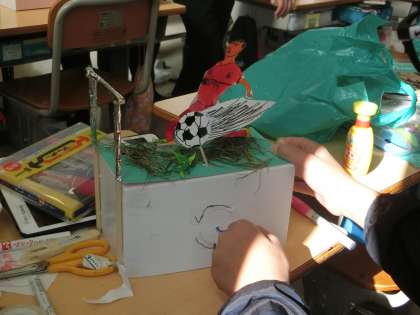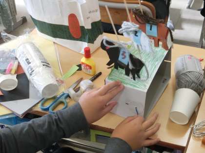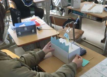 6年生の図工で、クランクを利用した作品を作っています。ハンドルを回すと、動くからくりになっています。上下の動きや左右の動きを工夫して作品を作っていました。