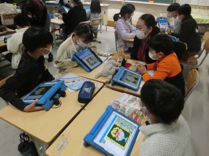 4年生の外国語活動で、オリジナルパフェを作って英語で紹介する活動を行っています。学習用タブレットで、果物を選んでパフェをつくり、班で紹介し合いました。この学習を通して、果物の英単語の語彙が増えていきます。