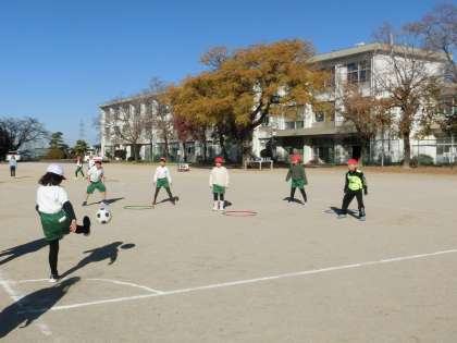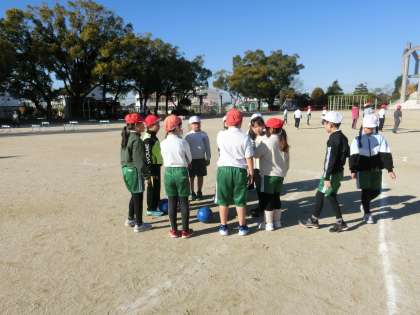 3年生の体育で、キックベースをやっています。ランニングホームランを見ることもできました。終わった後には、集まってふりかえりをしていました。