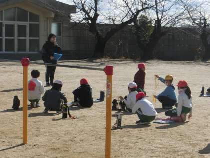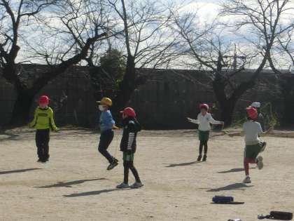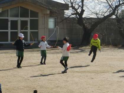 2年生の体育で、なわとびをしています。なわを回したり、タイミングよくとんだりする技能を身につけます。「家でも、練習しているよ」と教えてくれた児童もいました。