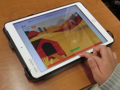 高学年のプログラミング学習の様子です。キャラクターにしゃべらせたり、飛んでくるボールをはね返して回数をスコアで表示したりするなど、プログラミングの命令の組み方で、いろいろなことができるようになってきています。