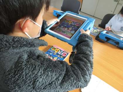 3年生の国語で、「本をしょうかいしよう」を学んでいます。友だちに紹介したい本を選んで、学習用タブレットの発表ノートで紹介文を考えていました。興味をもってもらために、紹介する本の表紙を写真で撮影して、紹介文に添えていました。