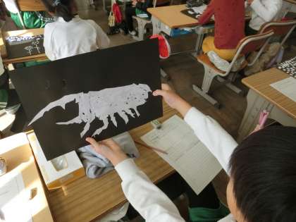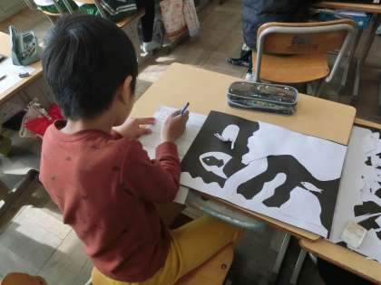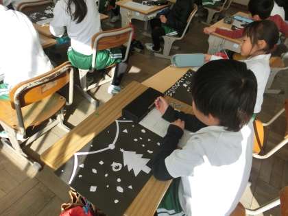 2年生の図工で、ハサミで切った画用紙を黒い台紙にはりつけて作品をつくりました。いろいろな形に切られた白い画用紙で、すてきな作品が完成しました。