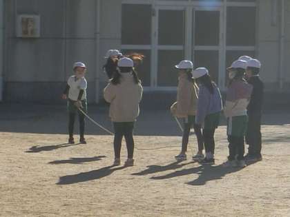 2年生の体育で、大なわ跳びをしています。2つのグループに分かれて、練習をしています。なわの回し方なども、アドバイスし合いながらたくさん跳べるように考えていました。