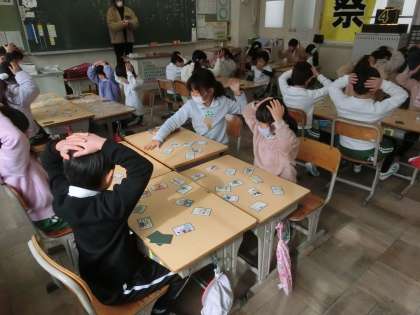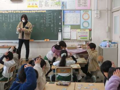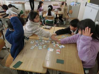 2年生の国語で、「ことわざ」を教材にしてカルタとりをしていました。楽しみながら、ことわざを知ることができる授業でした。