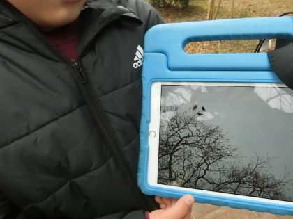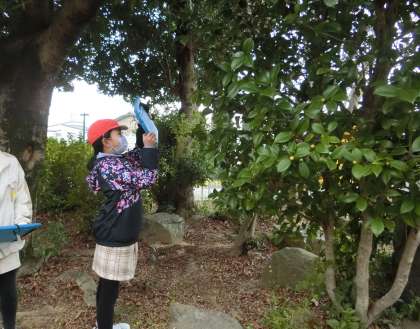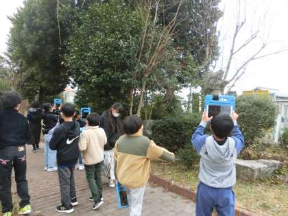 4年生の理科で、校内の冬の生物の観察を行っていました。冬の木や鳥などを見つけて、タブレットで記録しています。今まで観察してきた季節と、どんなところが変わっていたでしょうか。