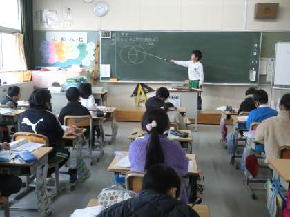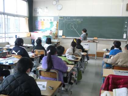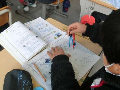 3年生の算数で、三角形を学んでいます。今日の授業では、コンパスでかいた重なった円を使ってつくった三角形が何三角形になるかを考えています。どんな理由で、何三角形といえるかを説明しています。