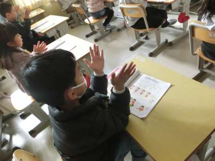 2年生の音楽で、わらべうたを学んでいます。「なべなべそこぬけ」「あんたがたどこさ」など歌いながら体を動かして、楽しく授業が進んでいきました。
