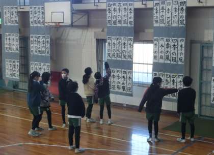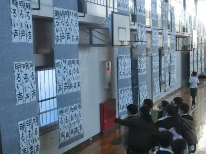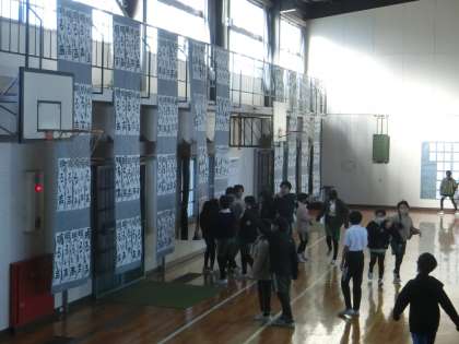 体育館に掲示された書き初め作品を、児童たちが鑑賞しています。来年の書き初め大会の参考にしている児童もいました。