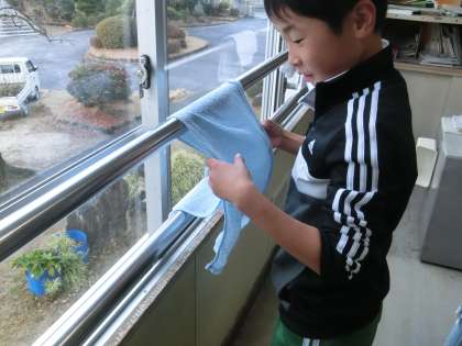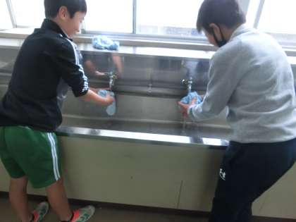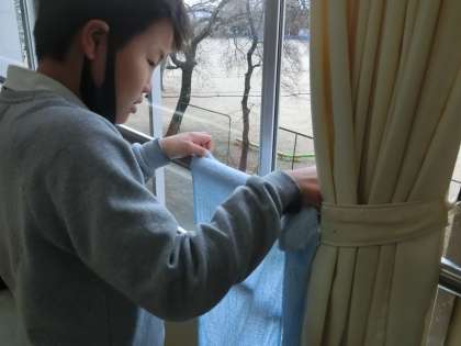 インフルエンザや新型コロナ対策として、秋から係の児童が教室にぬれタオルをかけて加湿をしています。