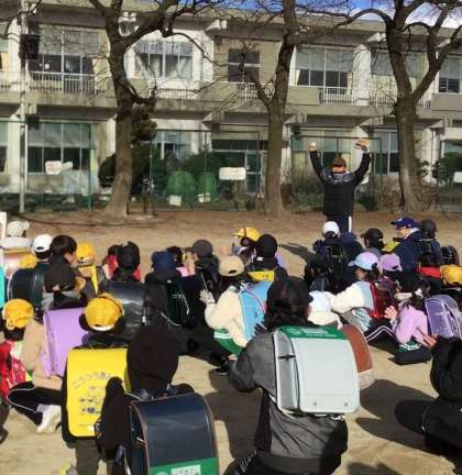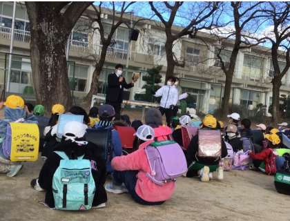 懇談会が終わった、最初の一斉下校の今日、全校児童の前で大谷選手のグローブでのキャッチボールの始球式を行いました。6年生の代表児童が、見事にボールをキャッチすると、大きな歓声が起こりました。