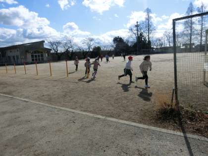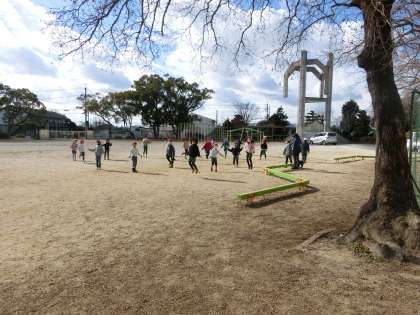 2年生の体育です。準備運動のあと運動場を走り、その後、なわとびの練習をしました。2月のなわとび納めの会で行う種目ができるように、目標をもって練習をしています。