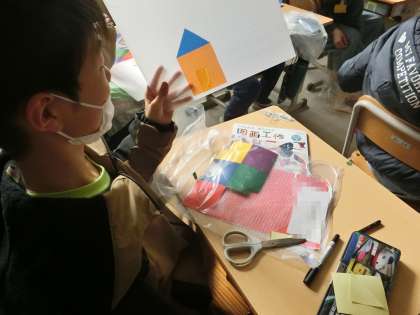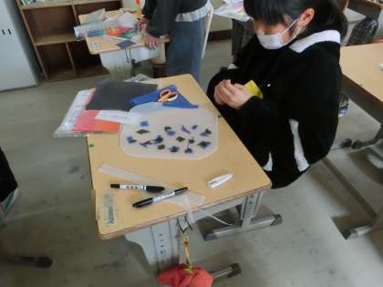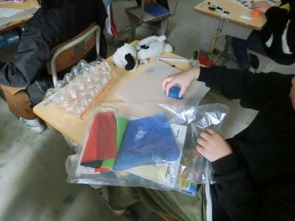 4年生の図工で、セロファンや半透明のボードなどを使って光のさしこむ絵を作ります。光がさすとどんな感じになるかという見通しをもって、作品作りをしています。