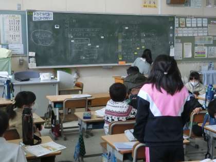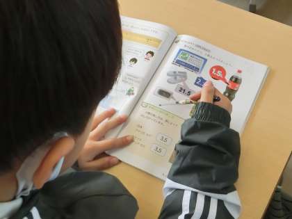 3年生の算数で、小数を学んでいます。写真は、身の回りにある小数を発表しているところです。身長や靴のサイズなど、身の回りで使われている小数をたくさん見つけることができました。