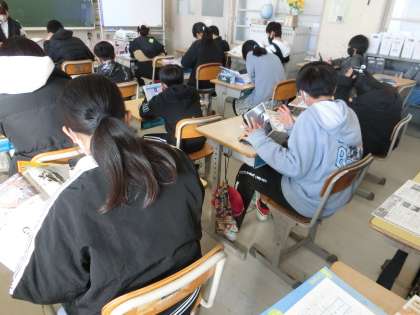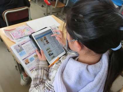 6年生が、社会の授業で歴史新聞を作っています。学習用タブレットを使って、レイアウトや文字の大きさ・色、写真を張り付けたりして工夫した新聞づくりをしています。新聞を作ることで、学んだことを表現し、伝える力もつけていきます。