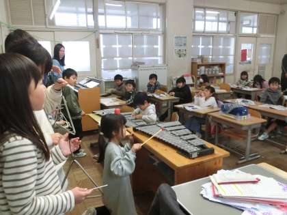 1年生の音楽で、打楽器の演奏をしています。夜の星空、夜明け前の星空のようすのちがいがよく分かるように、音の出し方を工夫していました。