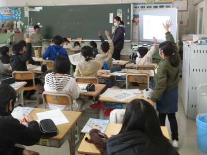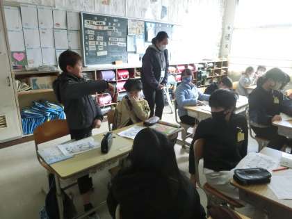 4年生の外国語活動です。地図をもとに、英語で道案内をしてどこにたどり着いたかをクイズ形式で学んでいました。出題者は「曲がる」、「右」、「左」、「まっすぐ進む」を英語で説明し、それを聞いた児童たちがどこにたどり着いたかを答えていました。