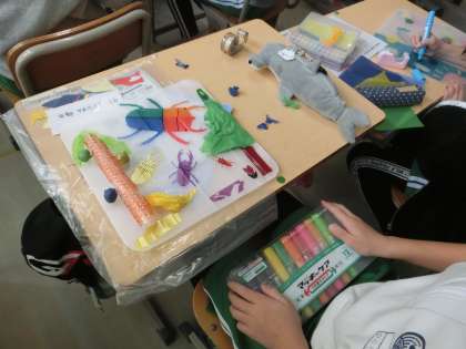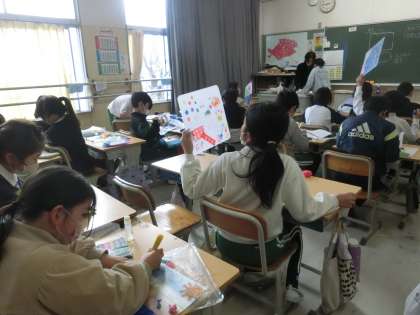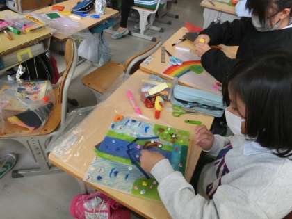 4年生の図工で、光のさしこむ絵を作っています。光の当たり具合によって、作品がどのように見えるのかを試している児童もいました。家でも窓際に飾れる作品ができそうです。
