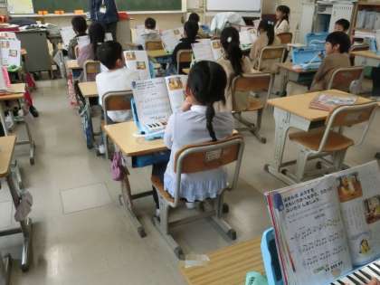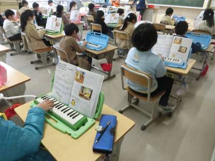2年生の音楽で、鍵盤ハーモニカの練習をしていました。「子ぎつね」という曲をリレー形式で演奏するなど、スモールステップで演奏ができるようにしていました。また、息のつよさに気をつけながら、曲調を考えて練習しています。