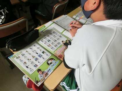6年生の英語の授業です。この時間は、中学校生活や将来の夢について、英語で会話をしていました。学習用タブレットで竜神中学校のことを調べたり、教科書で単語を調べたりして会話文を考えていました。