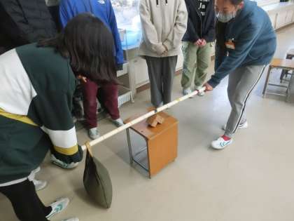6年生の理科で、てこのはたらきについて学んでいます。今日は、実験でてこを使って物体を動かすときの力の大きさを調べました。