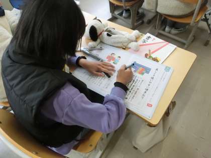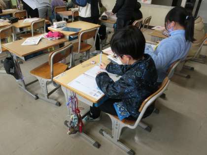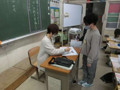 4年生の書写の授業です。鉛筆やフェルトペンを使って文字の練習をしています。書けた児童は、先生からよいところや改善点の助言をもらっていました。