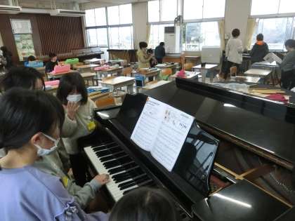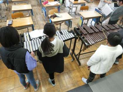 4年生の音楽では、いろいろな楽器を使った演奏の練習をしていました。楽器によって異なる音の響きを味わいながら、どのように曲を完成させるとよいかを考えながら練習をしています。グループでの共働的な学びの姿が見られました。