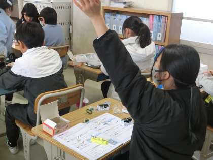 5年生の理科で、電磁石のしくみを学んでいます。今回の授業では、電磁石の磁石の力を大きくする方法を予想し、実験で確かめていました。電磁石のどの部分をどのように変えると磁石の力が大きくなったでしょうか。