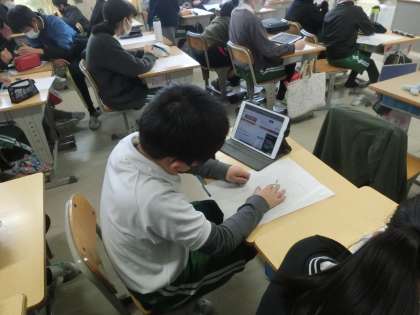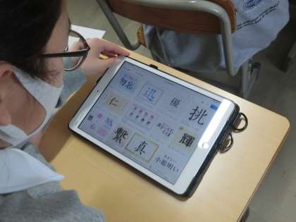 6年生の書写で、自分の思いを文字で表現する授業を行います。今までは、課題のお手本がありましたが、今回は自分の思いをどんな文字で表現しようかを考えていきます。写真は、学習用タブレットで、ヒントになりそうなものを調べているようすです。