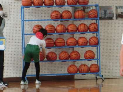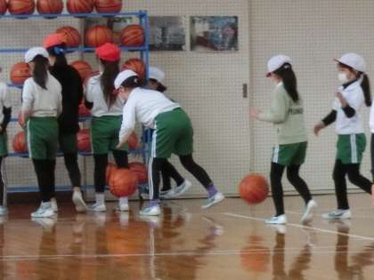 3年生の体育で、球技が始まりました。今日は、ドリブル練習をしていました。ボールを片付けるときもドリブルでボール置き場の近くまで行きました。