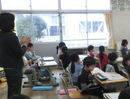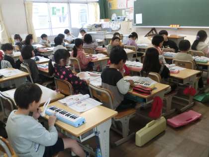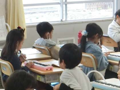 1年生の音楽です。先生の手拍子のリズムにあわせて、鍵盤ハーモニカの練習をしています。列ごとに練習し、互いの演奏を聞き合っていました。