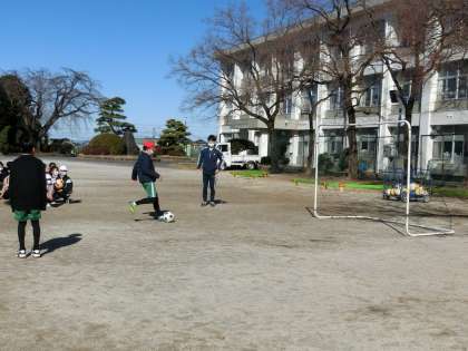 5年生は、サッカーの授業をしています。今日は、シュートの練習をしてます。パスからのシュート、ドリブルからのシュート、いろいろなパターンのシュートの技能を磨きます。