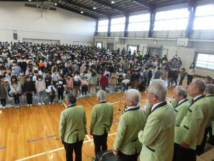 5時間目に、歌声集会を行いました。豊田市の男声合唱団「豊声(ほうせい)クラブ」の方々から、音楽の教科書でおなじみの曲や卒業生におくる曲など、力強く美しいハーモニーを聞かせていただきました。竹村小学校を卒業した団員の方からは、昔の竹村小学校の〇×クイズも出題していただきました。