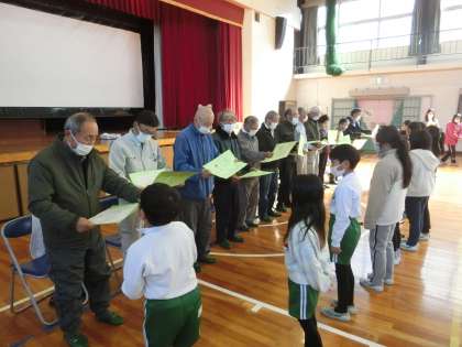 3年生が、野菜作りを教えていただいた竹ボラさんに感謝する会を行いました。各学級の代表が、野菜作りで学んだことや調べたことを学習用タブレットを使ってまとめ、発表しました。発表の中にはクイズもあり、竹ボラさんにも答えていただきました。その後、感謝状を贈りました。