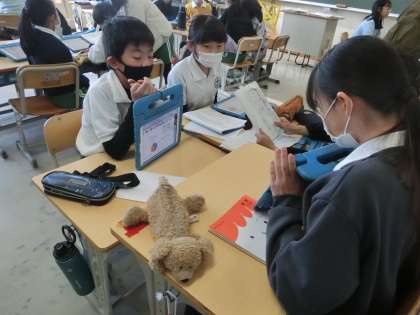 4年生の国語では、アンケート調査で調べた結果を学習用タブレットのプレゼンテーションソフトを使ってまとめました。発表原稿を考えたり、グループで報告の練習をして、アドバイスを伝え合ったりしていました。言葉だけでなく、図や表を使って調べたことを分析し、分かりやすい報告になるように考えました。