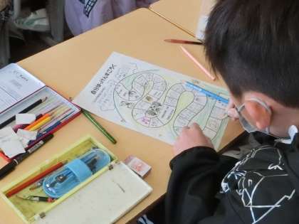 2年生が、生活科で「自分はっけんすごろく」をつくっています。スタートは誕生日で、ゴールは4月の3年生です。今まで頑張ってきたことと、3年生になる前の残りの1か月で何をがんばりたいかを考えて、すごろくのマスに書いていました。