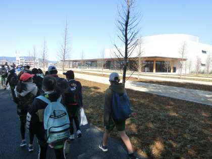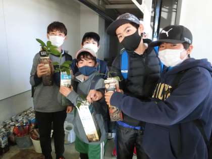 6年生が、4月下旬に開館する豊田市博物館の「どんぐりの森プロジェクト」に参加しました。写真の児童が手に持っているドングリの苗は、4年生のときから育ててきたものです。