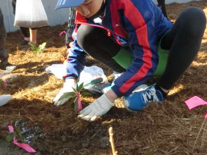 児童たちは、「大きく育ってね」「丈夫に育ってね」など、想いをこめてていねいに、苗の植樹を行いました。