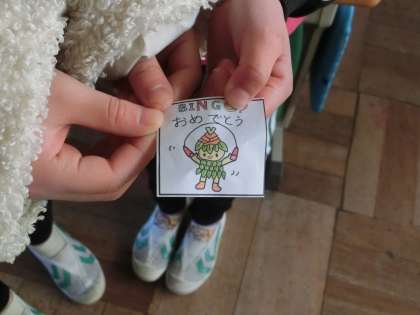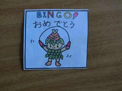 体育委員会が企画した「なわとびビンゴ」のビンゴ賞で、なわとびをしている「たけっこ」のカードが配られました。150周年を記念して誕生した竹村小学校のマスコットの今後の活躍も楽しみにしています。