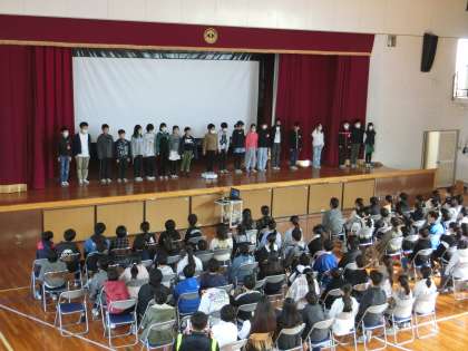 6年生のみなさん、今日は楽しんでいただけたでしょうか。今年1年間、竹村小学校を支えてくださり、ありがとうございました。みなさんが、引き継いできた竹村の伝統を今度は、5年生が引き継いでいきます。(司会の言葉より)