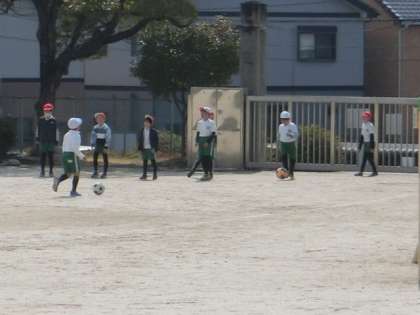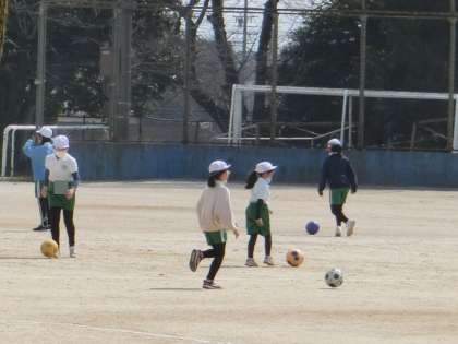 3年生の体育で、サッカーをしています。今回は、ボールをドリブルで運んで、リレーをしていました。うまくボールをコントロールして運ぶ技量を高めています。